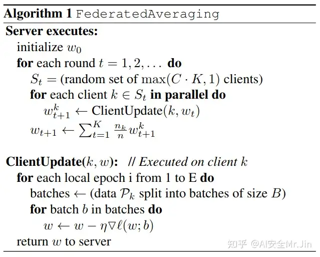 于是联邦学习就出现了:每个参与者拥有自己的数据,并且不希望把自己的数据泄露出去,但他们又想共同训练一个好用的模型。最初的联邦学习算法[1]如下: