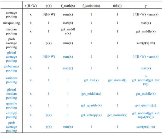 表 2-1 池化框架结构及各个池化方法在框架下的组成结构