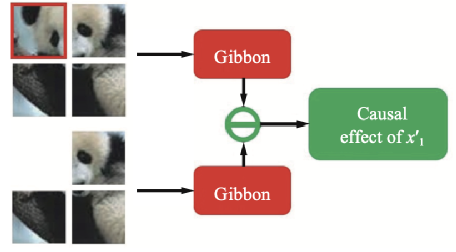 因此我们采用“干预”的方法来估计x'i与模型输出y的因果效应。我们人为地创造出一个反事实样本,在这个样本中x'i被去除,该反事实样本同样可以通过模型得到输出yi,此时我们比较原本的输出y与yi就可以有效地估计x'i对于y的平均因果效应,如图四所示。