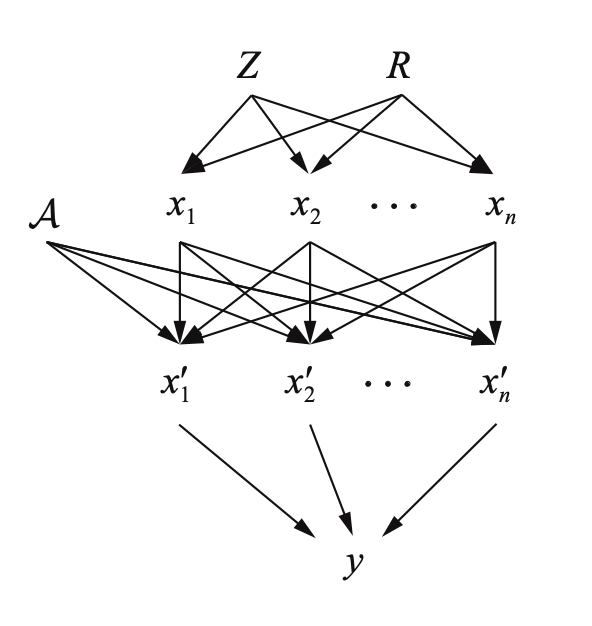 本文建立的因果图如图三所示。其中y为模型的输出,x’1 ... x’n表示对抗样本的n个子区域,x1 ... xn表示添加对抗扰动之前的原始样本的n个子区域,A表示对抗攻击方法,另外有两个隐含变量也表示在图中,即Z和R,这两个隐含变量表示了原始样本的因,其中Z表示与任务标签相关的因,R则表示与任务标签无关的因,例如在分类任务中,Z就代表了样本的真实类别,而R则代表与分类任务无关的背景、噪声等等因素的总和。