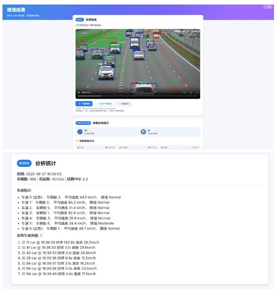 检测结果展示界面:该界面呈现分析处理后的视频结果,支持视频在线播放、下载及下载链接复制。同时,页面还提供结构化的数据分析面板,包括车辆类型统计、车道流量统计与可疑车辆追踪列表等多项信息,全面展示交通分析结果。