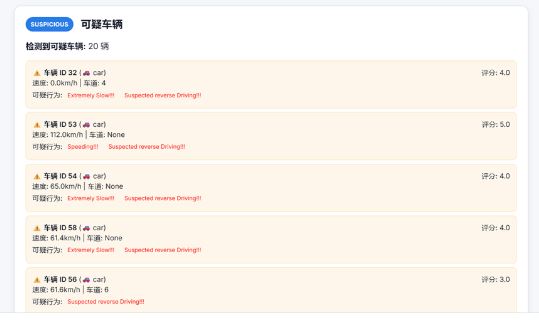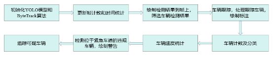 LaneVehicleProcessor类:作为系统的核心处理模块,此类集成了YOLO目标检测与ByteTrack多目标跟踪算法,逐帧处理视频并输出分析结果。它能够持续追踪车辆ID、类型、位置历史与实时速度,检测违规占用应急车道等行为,并对可疑车辆进行专门跟踪。所有分析结果均实时可视化叠加在视频帧上。该类的设计注重车辆状态的时序连续性,依托轨迹历史准确估算车速,同时生成包含统计数据和预警信息的完整输出,实现了从原始视频到结构化交通分析的全流程处理。