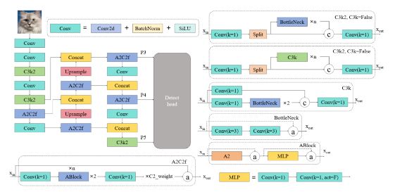 在结构设计上,YOLOv12较YOLOv11进行了重要调整。YOLOv11的骨干网络主要由Conv、C3K2、SPPF和C2PSA模块构成,其中C2PSA包含PSABlock子模块;而YOLOv12则使用A2C2f模块替换了YOLOv11中的部分C3K2模块及SPPF模块,并进一步减少了网络深度。