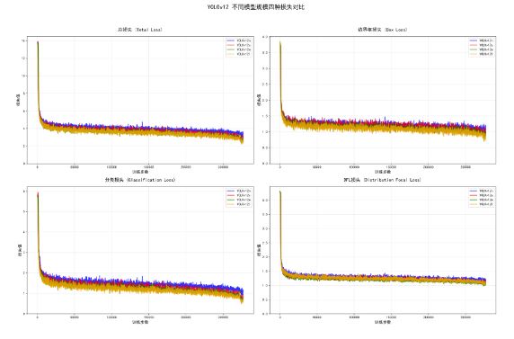 随后,采用YOLOv12论文中发布的超参数进行模型训练。训练损失曲线显示,经过600轮迭代后,各模型均趋于收敛,表明训练过程稳定有效。