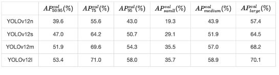 最后,基于训练所得的权重文件,我们在COCO验证集上进行了系统性能评估。实验设置保持一致:输入图像分辨率为640×640,批大小为32。不同规模的YOLOv12模型在该设置下的验证结果如下表所示,其精度与论文报告的性能基本一致,验证了迁移实现的有效性。