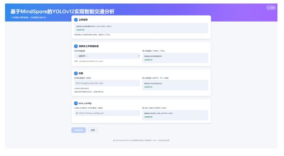 视频上传与参数配置界面:用户可在此上传待分析的视频文件,并灵活选择模型配置文件(YAML)、权重文件以及预定义的车道配置(JSON),完成设置后提交至后端进行推理分析。