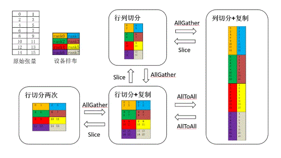 DTensor支持通过DTensor.redistribute接口与期望的分布式排布Layout,显式触发张量重排布流程。