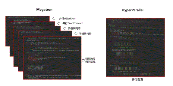 为了能够简化分布式训练当中针对并行场景的配置与适配,HyperParallel提供了声明式接口Cell.shard,使用该接口时,为Cell的输入,输出,以及Cell内的参数配置张量的分布式排布方式。HyperParallel将屏蔽分布式任务的细节,自动处理Cell内部参数的切分以及DTensor的重排布。相较于Megatron模型逻辑与分布式逻辑耦合的写法,采用HyperParallel声明式编程方式能极大简化开发的复杂度。