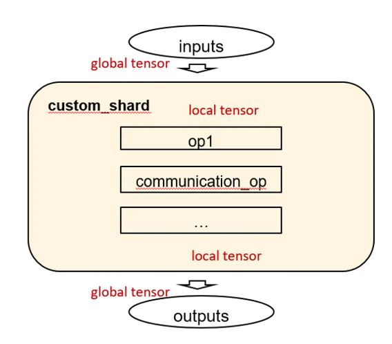 自定义并行是对算子级并行能力的补充。在算子级并行中,框架自动完成了算子切分后为保持数学等价性每个设备所需执行的算子序列推导及生成相关的集合通信操作。而自定义并行则支持用户手写并行接入dtensor并行流程HyperParallel提供声明式接口hyper_parallel.custom_shard,允许用户需提供一个自定义函数,并描述其输入/输出张量的切分形态。自定义函数是站在local tensor视角进行编程,内部可以显式调用集合通信接口,而其输入/输出通过切分形态的描述与前后的算子级并行进行衔接。