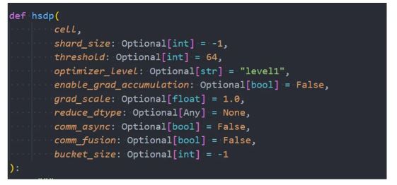 HyperParallel提供HSDP能力,通过使用声明式接口hyper_parallel.hsdp,配置shard_level为level1,level2,level3,以达到对标zero1, zero2, zero3级别的优化能力。