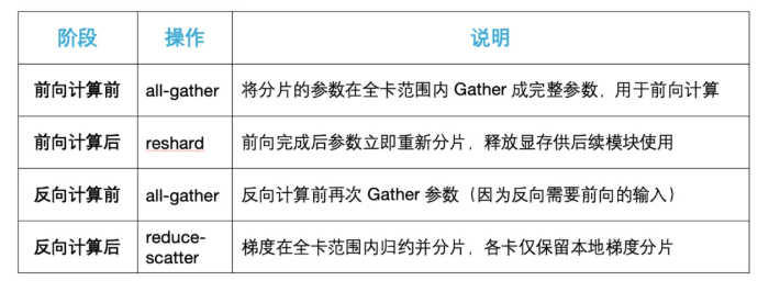 请勿这么做,否则会导致整个模型在前向前一次性 All‑Gather,显存峰值与完整模型相同,严重影响FSDP的显存优化效果。 HyperParallel-FSDP 默认采用 ZeRO-3 策略,参数、梯度、优化器状态均在所有设备间分片。完整的通信生命周期如下: