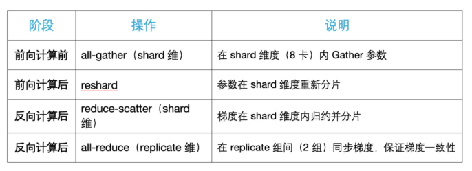 在实践中,一般将shard维配置在机内,shard 维度负责在每一步前向/反向计算中进行 All‑Gather 与 Reduce‑Scatter,这些通信在模型训练期间会频繁出现,机器内带宽相对较高,可以显著降低延迟和带宽瓶颈;在机器间仅做一次AllReduce用以同步冗余参数之间的梯度。