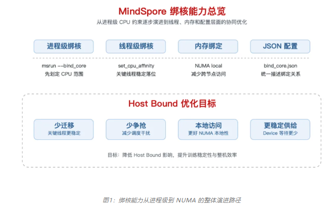 围绕 Host Bound 瓶颈,MindSpore 持续推进绑核能力演进:分布式进程级绑核 → 线程级精细化亲和 → 进程与线程协同隔离 → NUMA 级绑定 → 统一 JSON 配置;