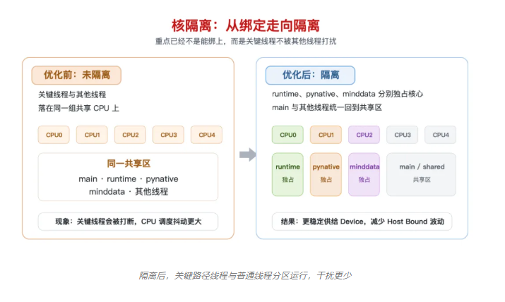 在线程级绑核基础上,MindSpore 进一步把资源管理思路从“绑定”推进到“隔离”。仅保证关键线程不迁移还不够,还需避免它们被其他线程抢占 CPU。