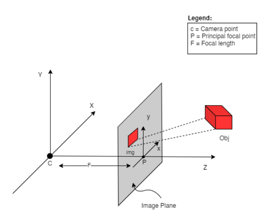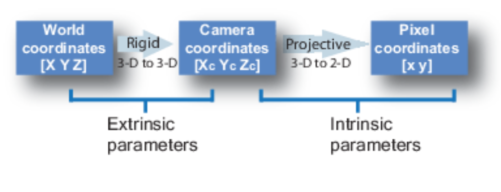 其中x是2-D图像点,X是3-D世界点,P是相机矩阵。P是 一个3 x 4矩阵,在将现实世界对象映射到图像平面上起着至关重要的作用。 相机矩阵是一个仿射变换矩阵,它与一个3 x 1列连接[image height, image width, focal length]以产生姿势矩阵。该矩阵的尺寸为3 x 5,其中第一个3 x 3块位于相机的视点中。轴是[down, right, backwards]或[-y, x, z]相机面向前方的位置-z。