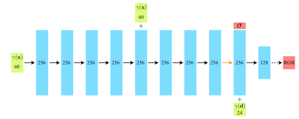图 6:数据管线 def trans_t(t): return np.array([[1, 0, 0, 0], [0, 1, 0, 0], [0, 0, 1, t], [0, 0, 0, 1]], dtype=np.float32) def rot_phi(phi): return np.array([[1, 0, 0, 0], [0, np.cos(phi), -np.sin(phi), 0], [0, np.sin(phi), np.cos(phi), 0], [0, 0, 0, 1]], dtype=np.float32) def rot_theta(th): return np.array([[np.cos(th), 0, -np.sin(th), 0], [0, 1, 0, 0], [np.sin(th), 0, np.cos(th), 0], [0, 0, 0, 1]], dtype=np.float32) def pose_spherical(theta, phi, radius): """pose_spherical""" c2w = trans_t(radius) c2w = np.matmul(rot_phi(phi / 180. * np.pi), c2w) c2w = np.matmul(rot_theta(theta / 180. * np.pi), c2w) c2w = np.matmul( np.array([[-1, 0, 0, 0], [0, 0, 1, 0], [0, 1, 0, 0], [0, 0, 0, 1]], dtype=np.float32), c2w) return c2w def load_blender_data(basedir, half_res=False, testskip=1): """load_blender_data""" splits = ['train', 'val', 'test'] metas = {} for s in splits: with open(os.path.join(basedir, f'transforms_{s}.json'), 'r', encoding='utf-8') as fp: metas[s] = json.load(fp) all_imgs = [] all_poses = [] counts = [0] for s in splits: meta = metas[s] imgs = [] poses = [] if s == 'train' or testskip == 0: skip = 1 else: skip = testskip for frame in meta['frames'][::skip]: fname = os.path.join(basedir, frame['file_path'] + '.png') tmp_img = cv2.imread(fname, cv2.IMREAD_UNCHANGED) tmp_img = cv2.cvtColor(tmp_img, cv2.COLOR_BGRA2RGBA) imgs.append(tmp_img) poses.append(np.array(frame['transform_matrix'])) imgs = (np.array(imgs) / 255.).astype( np.float32) # keep all 4 channels (RGBA) poses = np.array(poses).astype(np.float32) counts.append(counts[-1] + imgs.shape[0]) all_imgs.append(imgs) all_poses.append(poses) i_split = [np.arange(counts[i], counts[i + 1]) for i in range(3)] imgs = np.concatenate(all_imgs, 0) poses = np.concatenate(all_poses, 0) cap_h, cap_w = imgs[0].shape[:2] camera_angle_x = float(meta['camera_angle_x']) focal = .5 * cap_w / np.tan(.5 * camera_angle_x) render_poses = np.stack([ pose_spherical(angle, -30.0, 4.0) for angle in np.linspace(-180, 180, 40 + 1)[:-1] ], axis=0) if half_res: cap_h = cap_h // 8 cap_w = cap_w // 8 focal = focal / 8. imgs_half_res = np.zeros((imgs.shape[0], cap_h, cap_w, 4)) for i, img in enumerate(imgs): imgs_half_res[i] = cv2.resize(img, (cap_h, cap_w), interpolation=cv2.INTER_AREA) imgs = imgs_half_res return md.Tensor(imgs).astype("float32"), md.Tensor(poses).astype( "float32"), md.Tensor(render_poses).astype("float32"), [ cap_h, cap_w, focal ], i_split images, poses, render_poses, hwf, i_split = load_blender_data(datadir, half_res, testskip) print('Loaded blender', images.shape, render_poses.shape, hwf, datadir) i_train, i_val, i_test = i_split near = 2. far = 6. if white_bkgd: images = images[..., :3] * images[..., -1:] + (1. - images[..., -1:]) else: images = images[..., :3] if render_test: render_poses = poses[i_test.tolist()] # Cast intrinsics to right types cap_h, cap_w, focal = hwf cap_h, cap_w = int(cap_h), int(cap_w) hwf = [cap_h, cap_w, focal] NeRF 模型 该模型是一个多层感知器 (MLP),以ReLU作为其非线性。 论文摘录: “我们通过限制网络将体积密度sigma预测为仅位置的函数来鼓励表示是多视图一致的x,同时允许将RGB颜色c预测为位置和查看方向的函数。为此,MLP首先使用8个全连接层(使用ReLU激活和每层256个通道)处理输入3D坐标,并输出sigma和256维特征向量。然后将该特征向量与相机光线的观察方向连接并传递到一个额外的全连接层(使用ReLU激活和128个通道),输出与视图相关的RGB颜色。”