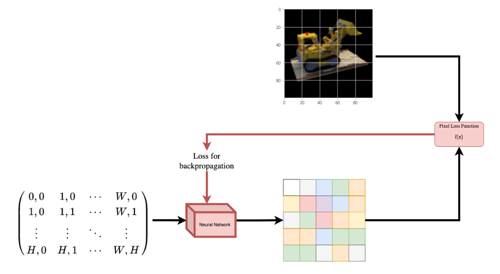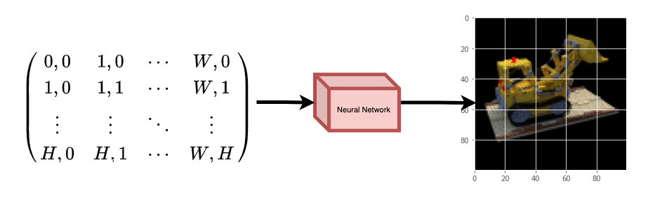 图 1:给定图像坐标的神经网络作为输入并要求预测坐标处的颜色。 神经网络会假设记忆(过拟合)图像。这意味着我们的神经网络会将整个图像编码为其权重。我们可以用每个位置查询神经网络,它最终会重建整个图像。