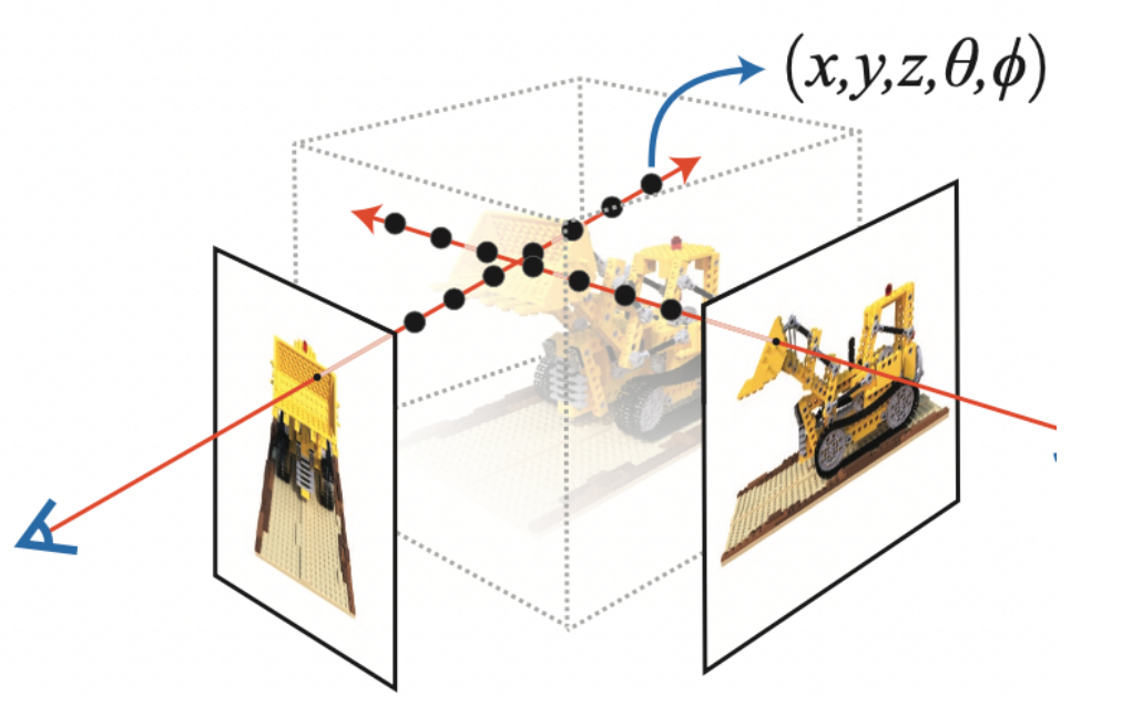 图 5:仿射变换。 COLMAP帧是[right, down, forwards]或[x, -y, -z]。在此处阅读有关COLMAP的更多信息。 下载数据 首先自行下载数据: NeRF Synthetics. 下载数据后, 按照以下结构安排数据: .datasets/ └── nerf_synthetics └── lego ├── test [600 entries exceeds filelimit, not opening dir] ├── train [100 entries exceeds filelimit, not opening dir] ├── transforms_test.json ├── transforms_train.json ├── transforms_val.json └── val [100 entries exceeds filelimit, not opening dir] 数据加载 datadir = Path("datasets/nerf_synthetics/lego") train_imgs = list((datadir / "train").glob("*.png")) num_images = len(train_imgs) temp_fname = str(train_imgs[np.random.randint(low=0, high=num_images)]) tmp_img = cv2.imread(temp_fname, cv2.IMREAD_UNCHANGED) tmp_img = cv2.cvtColor(tmp_img, cv2.COLOR_BGRA2RGBA) plt.imshow(tmp_img) plt.show() 数据管线 现在您已经了解了相机矩阵的概念以及从3D场景到2D图像的映射,让我们来谈谈逆映射,即从2D图像到3D场景。 我们需要讨论使用光线投射和追踪的体积渲染,这是常见的计算机图形技术。本节将帮助您快速掌握这些技术。 考虑一个带有N像素的图像。我们通过每个像素射出一条射线,并在射线上采样一些点。射线通常由方程参数化,r(t) =o+td其中t是参数,o是原点并且d是单位方向矢量。 我们考虑一条射线,并在射线上采样一些随机点。这些采样点每个都有一个独特的位置(x, y, z),并且光线有一个视角(theta, phi)。视角特别有趣,因为我们可以通过许多不同的方式通过单个像素拍摄光线,每种方式都有独特的视角。这里要注意的另一件有趣的事情是添加到采样过程中的噪声。我们为每个样本添加均匀的噪声,使样本对应于连续分布。这些采样点作为NeRF模型的输入。然后要求模型预测该点的RGB颜色和体积密度。