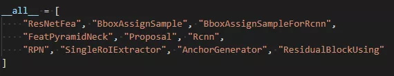 网络结构的定义是整个代码的核心部分,在FasterRcnn中,这一部分代码在src/FasterRcnn文件夹内,其中总体网络结构入口在src/faster_rcnn.r50.py