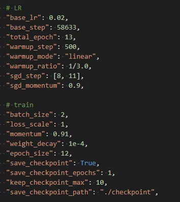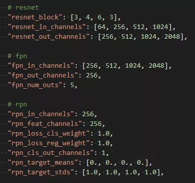 配置文件里包含了网络中各种参数配置,包括resnet的层数,fpn的特征层数,学习率,batchsize,momentum等等,下图列举了部分参数,完整参数可以查看src/config.py。