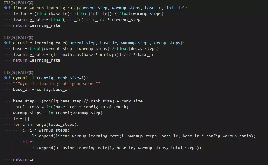 为了得到更好的训练效果,我们可以使用动态学习率来进行训练,在本文中,我们结合了warmup与cosine学习率来进行训练: