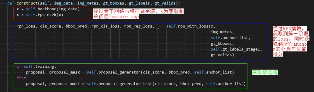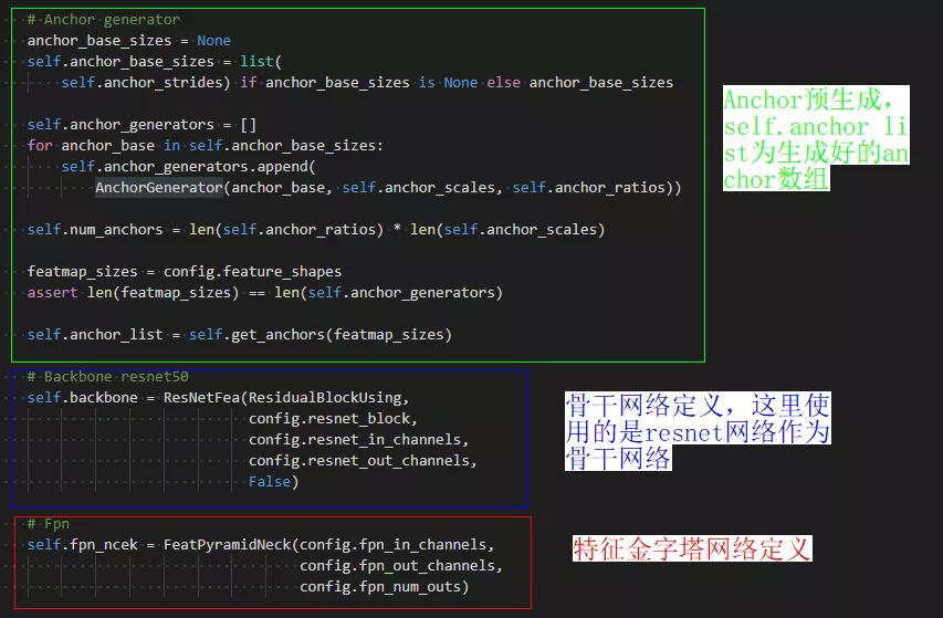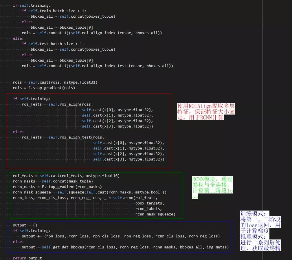 通过以上这些模块的组合,结合之前的网络结构介绍,我们就可以获取到一个完整的FasterRcnn网络的模型定义,下图就是部分整网定义的代码,完整的整网定义可以查看src/faster_rcnn.r50.py文件:
