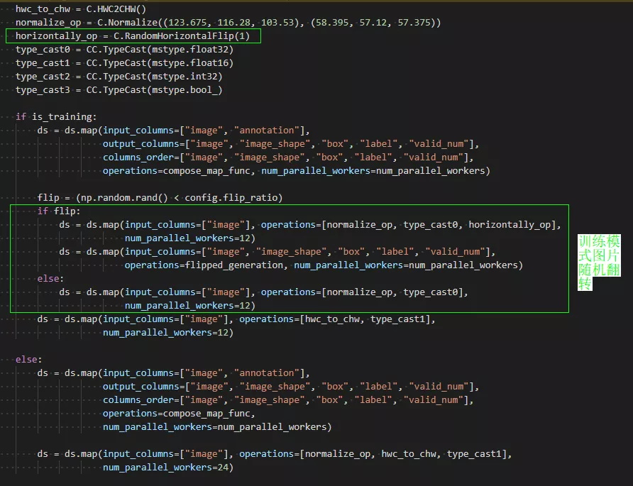 在训练与推理的时候,因为采用的数据增强方式不同,所以我们可以通过is_training标志位来区分数据处理,并且MindData中提供了大量高效的数据增强方式,我们可以快速调用这些数据增强,来提升我们的网络精度。