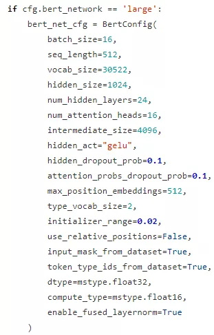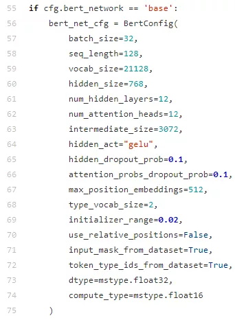接下来介绍一下MindSpore中Bert的相关代码,完整代码请参考: