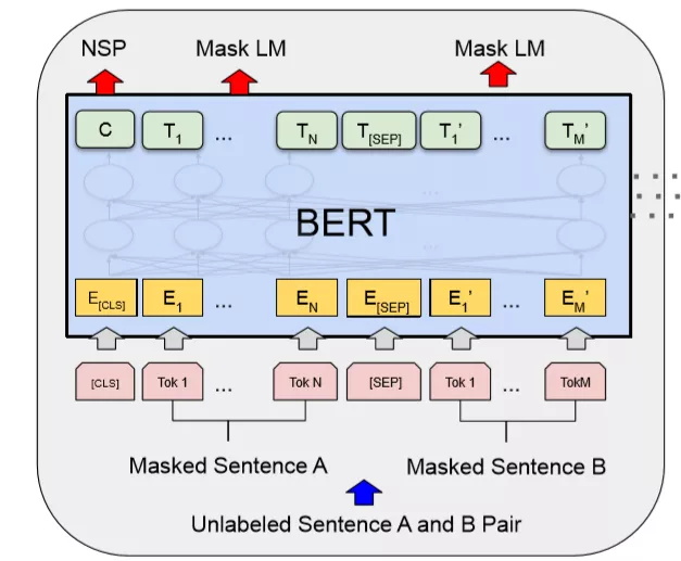 Bert的预训练包含两个任务Masked LM和NSP。Masked LM任务中会随机遮挡某些词,然后在输出的相应位置预测这些被遮挡词的原词,NSP任务会随机从另一个段落中取出第二“句”话,即两“句”话不一定是相连的两个,然后从[CLS]位判断两句话是否是相连的,经过处理后,上面的输入可能就变成: