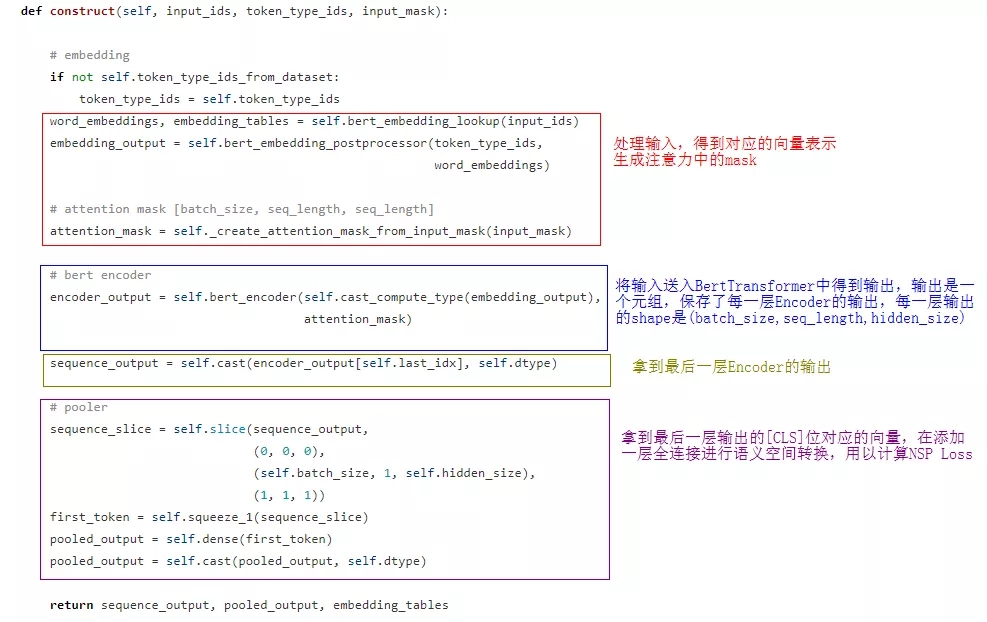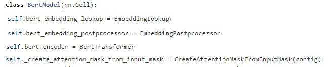 在init中声明了这几个类,EmbeddingLookup是生成词向量表然后得到输入的对应词向量、EmbeddingPostporcessor是为输入加上对应的A/B句子信息和位置信息,即EmbeddingPostporcessor输出的就是完整的输入(batch_size, seq_length, hidden_size)、CreateAttentionMaskFromInputMask是为self-attention中计算value值时加上一些mask即控制某些位置不对value做贡献,可以通过这个mask来控制每个词能看到的周围的词,默认是每个词可以看到句子中全部的词、BertTransformer中定义的是Transformer的结构。