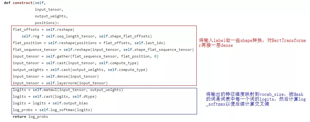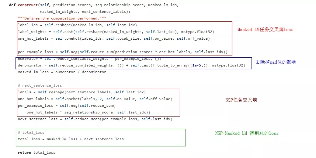 预训练loss相关代码在src/bert_for_pre_training.py中,GetMaskedLMOutput对应的Masked LM任务,