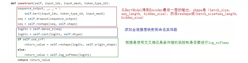 BertNERModel是应对命名实体识别任务的类,拿到Encoder最后一层的输出,将每一个词对应的向量映射到命名实体数,