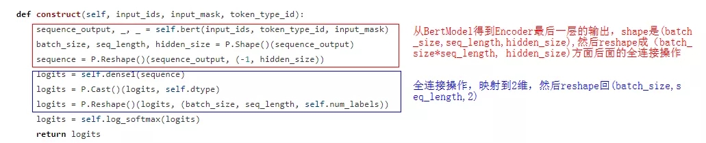 BertSquadModel是专门为Squadv1.1问答任务写的类,需要拿到Encoder最后一层的输出,将每一个词对应的向量映射到2维,表示是否是起始/结束位置