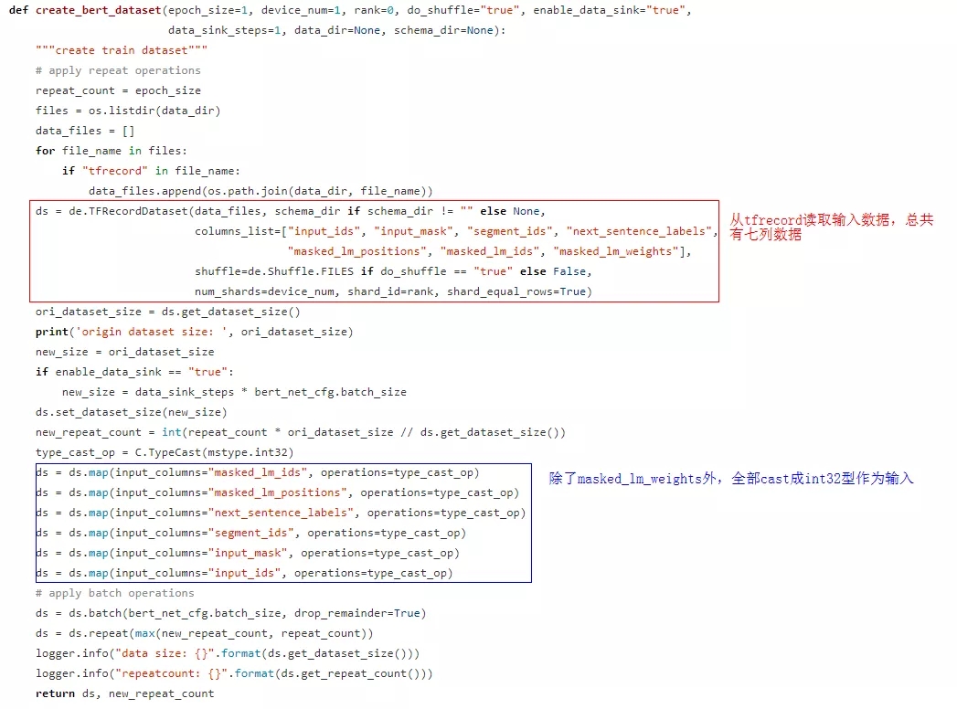 构造数据pipeline的代码存放在src/dataset.py中,是事先将文本数据转换成需要的输入格式然后封装为tfrecord或者mindrecord格式进行读取。