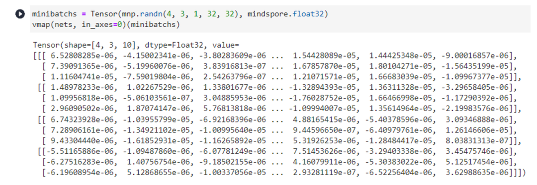 通过这种方式,我们可以实现批量输入在同一个模型上进行训练或推理等功能,与现有网络模型输入支持batch轴输入的区别在于,利用Vmap实现的批处理维度更加灵活,不局限于NCHW等输入格式。