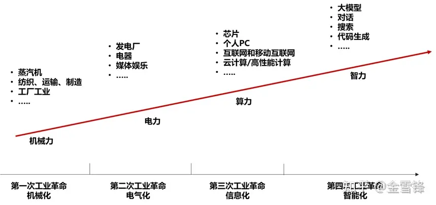 - 能力递进的角度:机械的广泛使用为电力的诞生产生了条件,电力则是算力产生的基础,最后算力又是智力的涌现的基石。