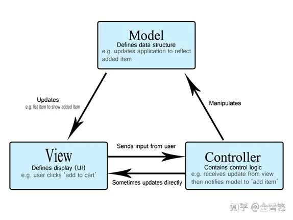 传统应用软件的编程范式,特别是桌面程序/App,主要就是MVC,当然MVC到现在有许多变种,这里就不一一介绍了:
