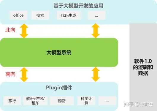 • 简单的应用,比如提供数据源(日历)和弱控制(家电控制),会被大模型系统聚合,这些应用蜕变成一个Plugin接入到这个大模型系统中,成为南向,而大模型系统则变成了一个超级应用,为所有这些plugin提供自然交互和控制能力,典型的例子是ChatGPT Plugin体系,这里plugin为大模型系统提供数据获取、逻辑推理、服务调用等能力。