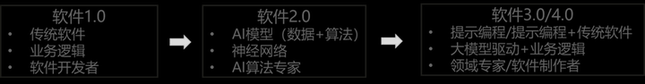 第二个是对软件形态的影响,大模型出现后,软件将进入3.0/4.0时代,其主要特征是prompt编程将成为软件的很重要一部分,许多软件将内嵌大模型的能力,同时prompt代码与传统软件代码会进行有效的协同。