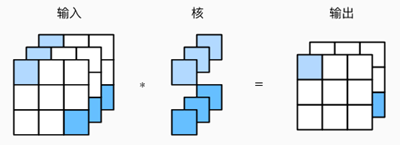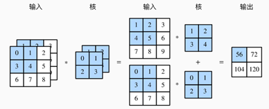 下面展示的是2个输入通道的二维互相关计算,二维输入数组与二维核数组做互相关运算,再按通道数相加得到输出。