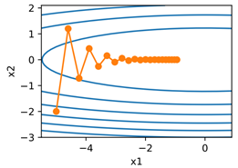 可以看到,目标函数在竖直方向比在水平方向的斜率的绝对值更大。因此给定学习率,梯度下降迭代自变量时会使自变量在竖直方向比在水平方向移动幅度更大。那么,我们需要一个较小的学习率从而避免自变量在竖直方向上越过目标函数最优解。然而这样也会造成自变量在水平方向上朝最优解移动变慢。