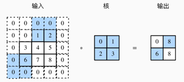 这就证明,输出数组的高和宽会分别增加ph和pw。所以,如果想要了解在构造网络时推测每个层的输出形状。我们可以设置ph=kh -1和pw=kw-1使得输入和输出具有相同的高和宽。