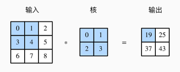 首先了解一下卷积核数组在输入数组中的计算方式,虽然卷积层得名于卷积(convolution)运算,但我们通常在卷积层中使用更加直观的互相关(cross-correlation)运算。在二维卷积层中,一个二维输入数组和一个二维核(kernel)数组通过互相关运算输出一个二维数组。