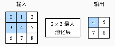 如下图1中所示,池化的窗口形状是2×2的最大池化,默认步幅都为1。阴影部分为第一个输出元素和计算所使用的输入元素。输出数组的高和宽分别为2,其中的4个元素由取最大值运算max得出: