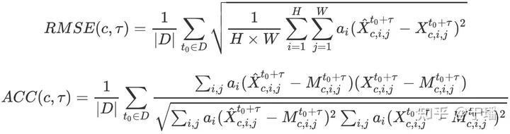 _RMSE_和_ACC_的计算方式如下所示,D_代表测试集,τ_代表预测的提前时间步数,为了比较伏羲模型与基准模型的预测性能,对(RMSEA-RMSEB)/RMSEB_和(ACCA-ACCB)/(1-ACCB)_进行可视化。