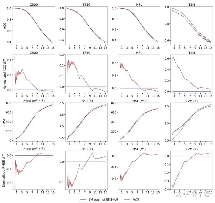 图4. ECMWF EM和伏羲的全球平均纬度加权ACC和RMSE以及归一化ACC和RMSE差异的比较