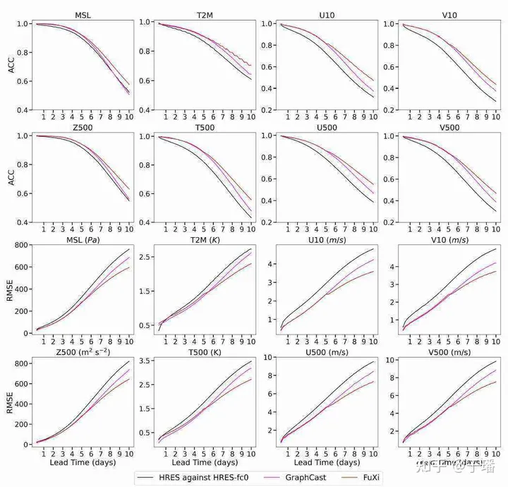 图3. HRES、GraphCast和伏羲的全球平均纬度加权 ACC 和 RMSE 比较