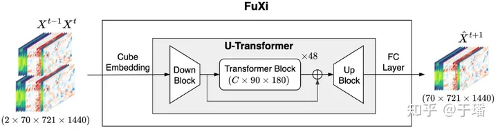 基本的伏羲模型体系结构由三个主要组件组成,如图所示: cube embedding、U-Transformer和全连接层。输入数据结合了上层空气和地表变量,并创建了一个维度为2×70×721×1440的数据立方体,以两个时间步作为一个step。