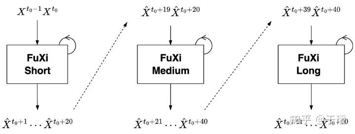 使用伏羲-Short的权重来初始化伏羲-Medium模型,然后对其进行微调,以实现从5天到10天(21-40个时间步)的最佳预报性能。其中,伏羲-Short模型在第20个时间步(第5天)的输出是伏羲-Medium模型的输入,直接实时进行伏羲-Short模型的在线推理会导致显著的内存消耗并且降低微调速度。因此需要提前在六年(2012-2017年)的数据上计算并将伏羲-Short模型的输出结果缓存到硬盘上。