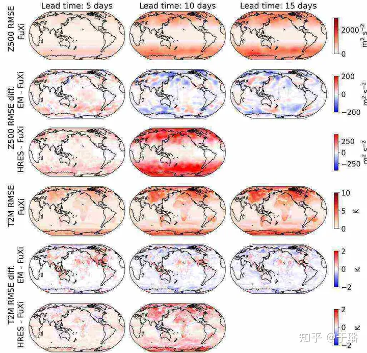 更进一步,通过FuXi的平均RMSE、ECMWF HRES与FuXi之间的_RMSE_差异,以及ECMWF EM与FuXi之间的_RMSE_差异的空间分布可视化看到,三个预测的空间误差分布相似。最高的_RMSE_值出现在高纬度地区,而相对较小的值出现在中低纬度地区。在陆地上,_RMSE_值较海洋上较高。ECMWF HRES与FuXi之间的_RMSE_差异显示FuXi在大多数网格点上表现优于ECMWF HRES,如红色占优势所示。相比之下,ECMWF EM在大多数区域与FuXi表现相当,如白色占优势所示。